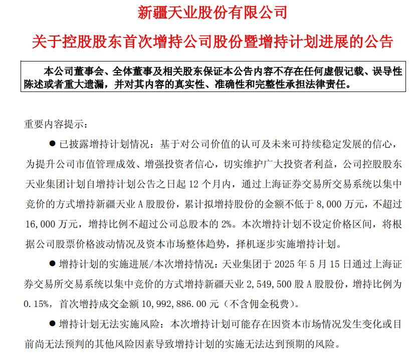 5月16日,新疆天业发布公告,公司控股股东天业集团于2025年5月15日通过上海证券交易所交易系统以集中竞价的方式增持公司254.95万股A股股份,增持比例为0.15%,首次增持成交金额1099.29万元(不含佣金税费)。 公告称,本次增持计划的实施不会导致公司股权分布不具备上市条件,也不会导致公司控股股东及实际控制人发生变化。 |