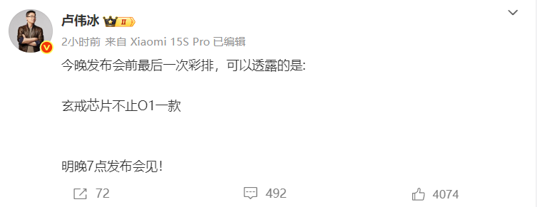 5月21日,卢伟冰发微博发文称,今晚发布会前最后一次彩排,可以透露的是: 玄戒芯片不止O1一款,明晚7点发布会见! 事件经过叙述 5月15日,雷军微博发文表示,小米自主研发设计的手机SoC芯片,名字叫玄戒O1,即将在5月下旬发布。 5月17日,卢伟冰透露,搭载小米自研“玄戒 O1”芯片的产品不仅仅是手机,其他产品也会搭载。 5月20日,雷军微博发文称,小米玄戒O1,小米自主研发设计的3nm旗舰芯片,已开始大规模量产,搭载小米玄戒O1两款旗舰。 |