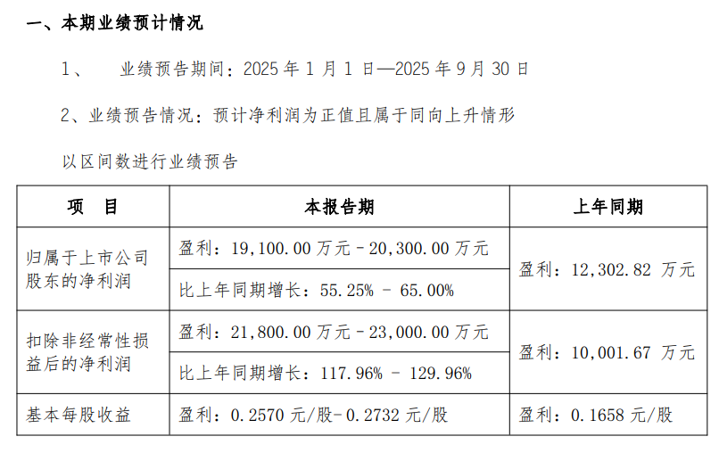 10月19日,长青集团(002616.SZ)披露2025年前三季度业绩预告,公司预计归属于上市公司股东的净利润1.91亿元至2.03亿元,同比增长55.25%至65%;扣除非经常性损益后的净利润2.18亿元至2.3亿元,同比增长117.96%至129.96%。 公司2025年前三季度业绩较上年同期增加,主要是取得资源综合利用增值税优惠政策的项目增加,即征即退税额增加;燃料成本同比下降。 公告称,公司不存在影响本次业绩预告内容准确性的重大不确定因素。本次业绩预告的财务数据为初步核算数据,未经会计师事务所审计,与2025 年第三季度报告中披露的最终数据可能存在差异,具体数据以 2025 年第三季度报告披露的数据为准。 |