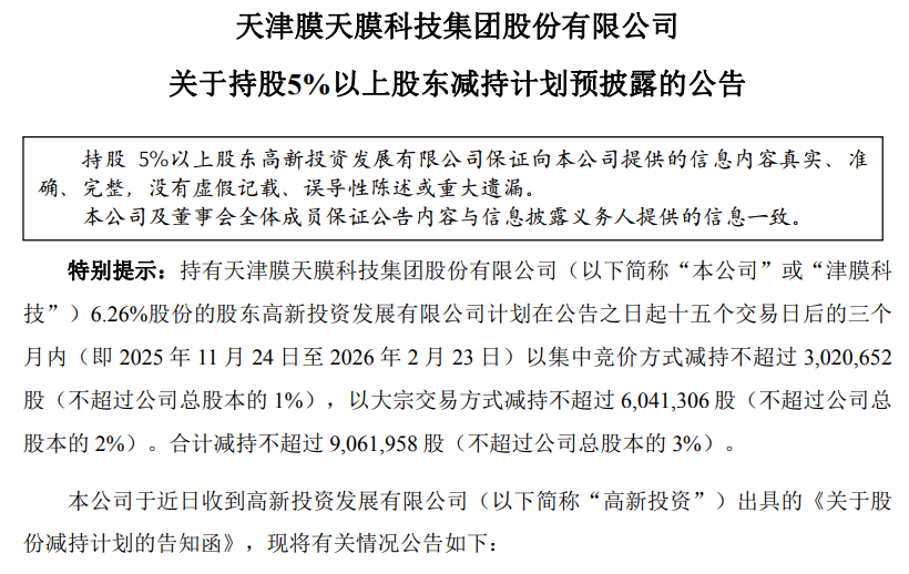 11月2日,津膜科技(300334.SZ)发布公告,公司股东高新投资发展有限公司计划在公告之日起十五个交易日后的三个月内(即2025年11月24日至2026年2月23日)以集中竞价方式减持不超过302.07万股(不超过公司总股本的1%),以大宗交易方式减持不超过604.13万股(不超过公司总股本的2%)。合计减持不超过906.2万股(不超过公司总股本的3%)。 公告称,高新投资不是本公司控股股东、实际控制人。本次减持不会导致本公司控制权发生变更,不会对本公司的治理结构和持续经营造成重大不利影响。