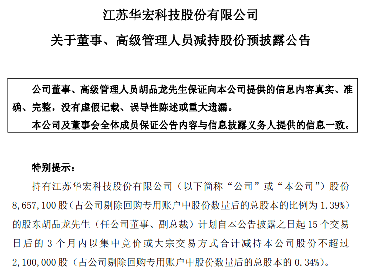11月8日,华宏科技(002645.SZ)发布公告,公司股东胡品龙先生(任公司董事、副总裁)计划自本公告披露之日起15个交易日后的3个月内以集中竞价或大宗交易方式合计减持公司股份不超过210万股(占公司剔除回购专用账户中股份数量后的总股本的0.34%)。 公告称,本次减持计划的实施存在不确定性风险,相关减持主体将根据市场情况、公司股价情况等情形决定是否全部实施或部分实施本次股份减持计划,公司将按规定披露减持计划的实施进展情况。 此外,胡品龙先生不是公司控股股东、实际控制人,本次减持计划的实施不会导致公司控制权发生变更,也不会对公司治理结构及持续经营产生重大影响。 |