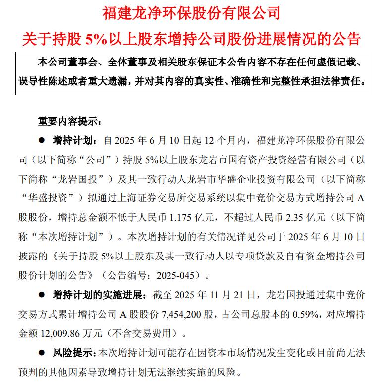 11月22日,龙净环保(600388.SH)发布公告,截至2025年11月21日,龙岩国投通过集中竞价交易方式累计增持公司A股股份745.42万股,占公司总股本的0.59%,对应增持金额1.2亿元(不含交易费用)。 公告称,本次增持计划可能存在因资本市场情况发生变化或目前尚无法预判的其他因素导致增持计划无法继续实施的风险。如遇上述风险情形,公司将及时履行信息披露义务,敬请广大投资者注意投资风险。 |