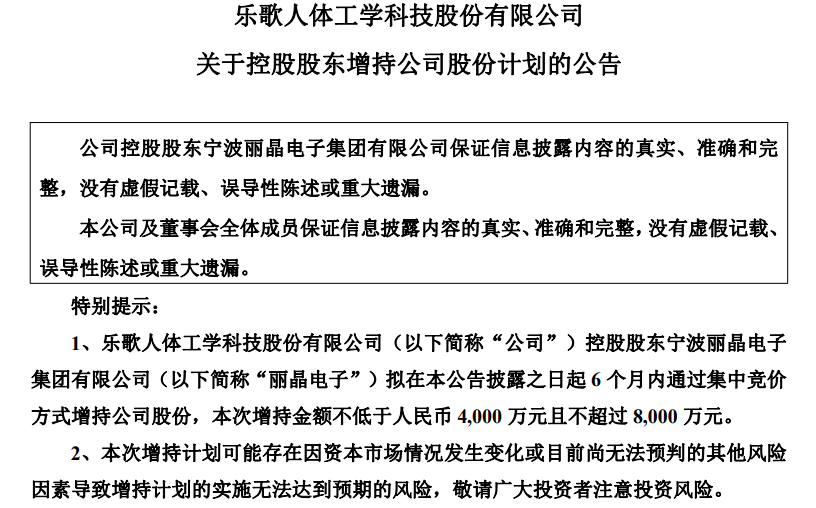 11月24日,乐歌股份(300729.SZ)发布公告,公司控股股东宁波丽晶电子集团有限公司(简称“丽晶电子”)拟在本公告披露之日起6个月内通过集中竞价方式增持公司股份,本次增持金额不低于4000万元且不超过8000万元。 公告称,本次增持计划可能存在因资本市场情况发生变化或目前尚无法预判的其他风险因素导致增持计划的实施无法达到预期的风险,敬请广大投资者注意投资风险。 本次拟增持股份的目的为控股股东丽晶电子基于对公司未来持续发展前景的信心以及对公司投资价值的认同,为促进公司持续稳定、健康发展,提升投资者信心,拟实施本次增持计划。 |