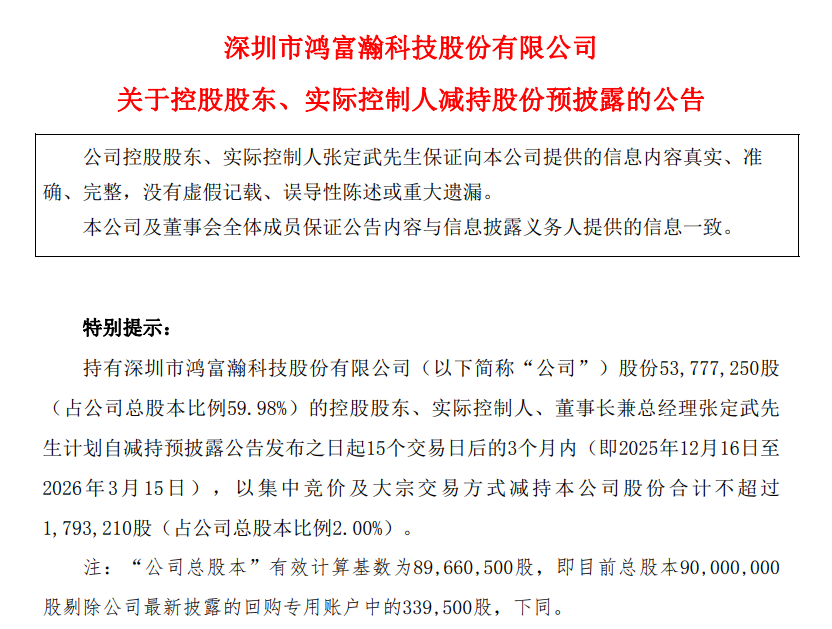 11月24日,鸿富瀚(301086.SZ)发布公告,公司控股股东、实际控制人、董事长兼总经理张定武先生计划自2025年12月16日至2026年3月15日以集中竞价及大宗交易方式减持公司股份合计不超过179.32万股(占公司总股本比例2.00%)。 公告称,本次减持计划的实施存在不确定性,张定武先生将根据市场情况、公司股价情况等情形择机决定是否全部或部分实施本次股份减持计划。 此外,张定武先生系公司控股股东、实际控制人、董事长、总经理,其减持行为不会影响公司的治理结构和持续经营,不会导致公司控制权发生变更。 |