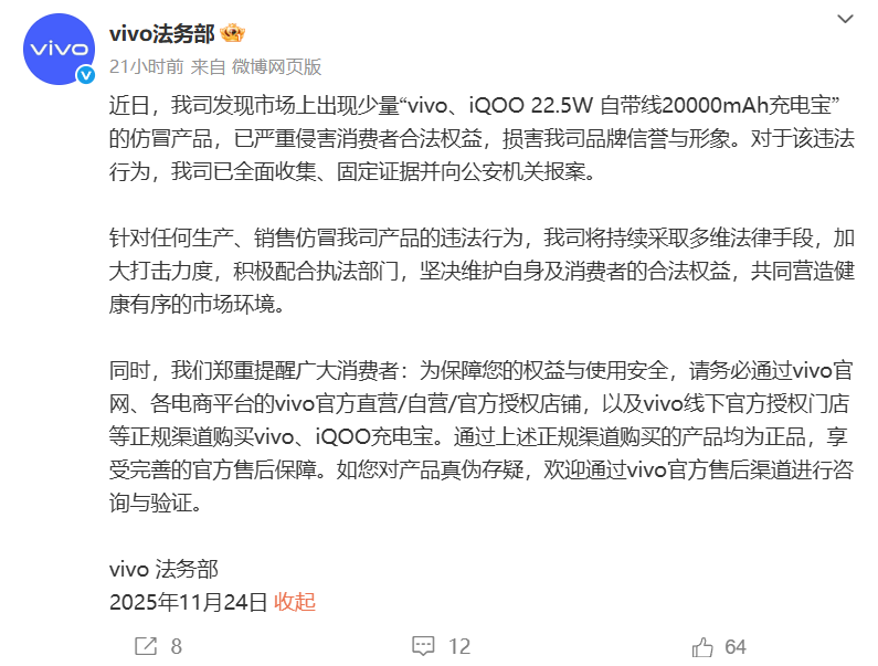 近日,vivo法务部发文称发现市场上出现少量“vivo、iQOO 22.5W 自带线20000mAh充电宝”的仿冒产品,已严重侵害消费者合法权益,损害我司品牌信誉与形象。对于该违法行为,我司已全面收集、固定证据并向公安机关报案。 针对任何生产、销售仿冒我司产品的违法行为,我司将持续采取多维法律手段,加大打击力度,积极配合执法部门,坚决维护自身及消费者的合法权益,共同营造健康有序的市场环境。 此外,vivo同时呼吁消费者通过正规渠道购买产品。 |
