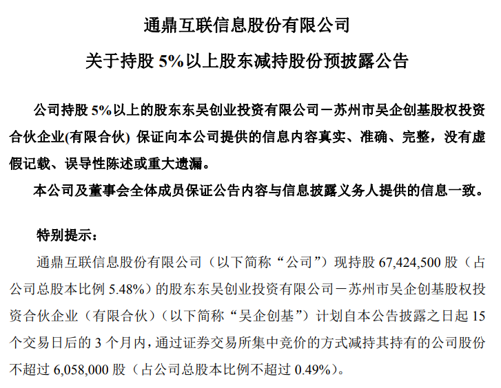 11月25日,通鼎互联(002491.SZ)公告,公司股东东吴创业投资有限公司-苏州市吴企创基股权投资合伙企业(有限合伙)(简称“吴企创基”)计划自本公告披露之日起15个交易日后的3个月内,通过证券交易所集中竞价的方式减持其持有的公司股份不超过605.8万股(占公司总股本比例不超过0.49%)。 公告称,本次减持计划的实施存在不确定性,吴企创基将根据市场情况、公司股价情况等情形决定是否实施本次股份减持计划。公司将持续关注本次减持计划的进展情况,并按照相关规定履行信息披露义务。 此外,吴企创基不是公司控股股东、实际控制人,本次减持计划实施不会影响公司的治理结构和持续经营,亦不会导致公司控制权发生变更。 |