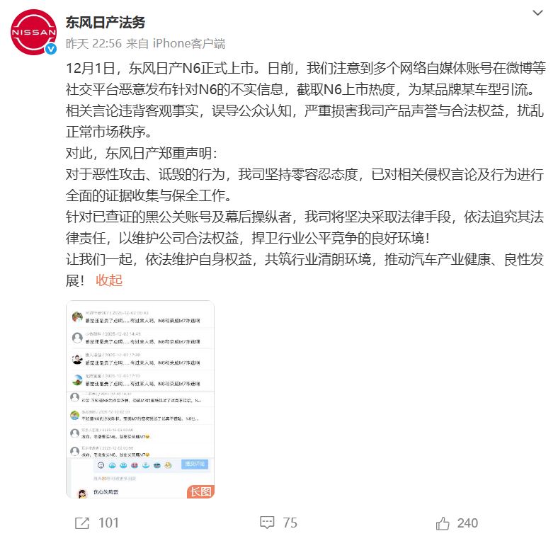 近日,东风日产法务发文称东风日产 N6 上市后,注意到多个网络自媒体账号在微博等社交平台恶意发布针对 N6 的不实信息,截取 N6 上市热度,为某品牌某车型引流。相关言论违背客观事实,误导公众认知,严重损害该公司产品声誉与合法权益,扰乱正常市场秩序。 对此,东风日产法务表示,对于恶性攻击、诋毁的行为,我司坚持零容忍态度,已对相关侵权言论及行为进行全面的证据收集与保全工作。 针对已查证的黑公关账号及幕后操纵者,我司将坚决采取法律手段,依法追究其法律责任,以维护公司合法权益,捍卫行业公平竞争的良好环境!