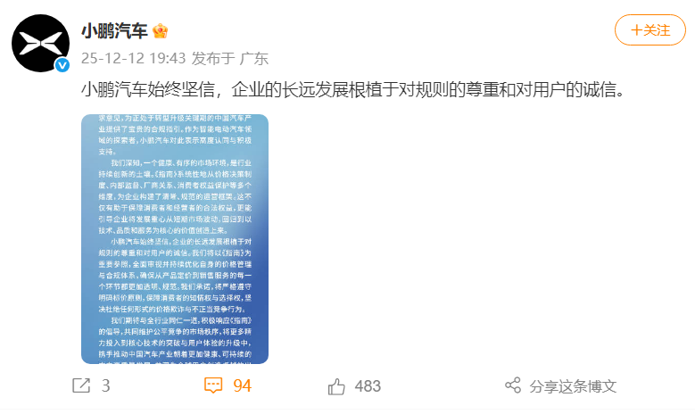 12月12日,小鹏汽车发布关于支持《汽车行业价格行为合规指南》的声明。 小鹏汽车表示,全面审视并持续优化自身的价格管理与合规体系,确保从产品定价到销售服务的每一个环节都更加透明、规范。 承诺将严格遵守明码标价原则,保障消费者的知情权与选择权,坚决杜绝任何形式的价格欺诈与不正当竞争行为。 对此,有分析人士认为,随着相关行业指引的推出与头部企业的率先表态,或将进一步推动汽车销售与服务环节的标准化与规范化发展,有助于构建更加诚信、健康的汽车消费生态。 |
