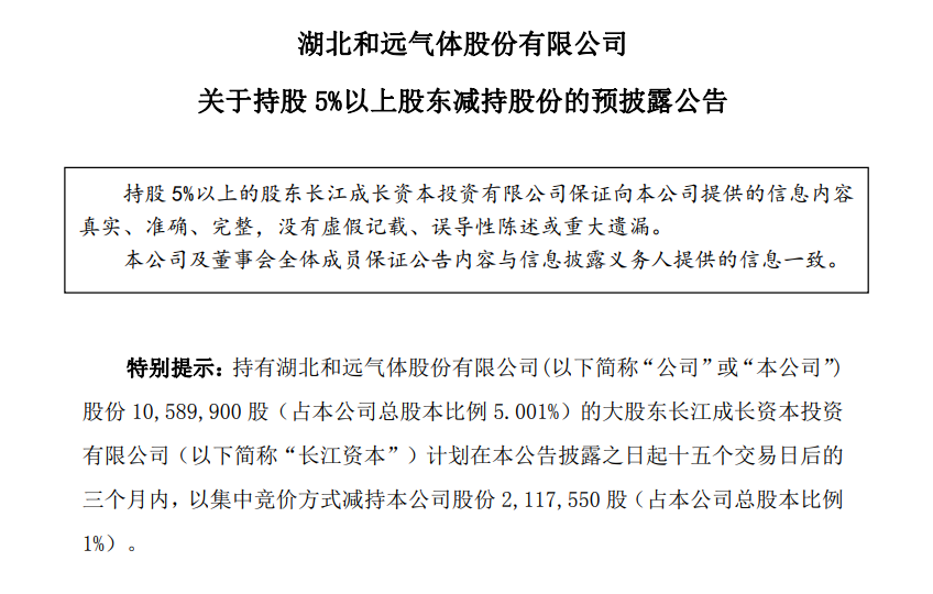 12月16日,和远气体(002971.SZ)发布公告,持股5.001%的大股东长江成长资本投资有限公司(简称“长江资本”)计划在公告披露之日起十五个交易日后的三个月内,以集中竞价方式减持公司股份211.76万股(占公司总股本比例1%)。 公告称,长江资本在减持期间,将根据市场情况、公司股价等因素选择是否实施及如何实施减持计划,减持数量和价格存在不确定性。 此外,长江资本本次减持计划的实施不会导致公司控制权发生变更,也不会对公司治理结构及持续经营产生影响。 |