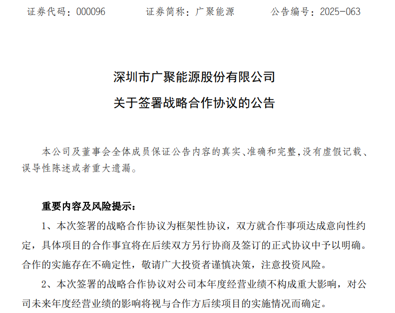 12月25日,广聚能源(000096.SZ)发布公告,公司与中广核(广东)新能源投资有限公司(以下简称“中广核广东公司”)于2025年12月24日签署了《战略合作协议》,双方基于战略合作关系,拟开展在新能源项目投资、售电、虚拟电厂等领域的合作,共同提升核心竞争力,实现经济效益与社会效益协同增长,双方建立长期稳定合作关系。 公告称,本协议的签署,旨在建立战略合作关系,整合双方资源与优势,为公司在新能源领域的业务布局提供协同发展路径;有助于公司优化产业结构,增强在综合能源领域的市场竞争力,符合公司打造大湾区一流综合能源运营商功能定位及发展战略。 此外,本次签署的战略合作协议为框架性协议,是双方进一步合作的基础依据,除保密条款外,双方互不依据本协议追究对方的违约责任。具体项目的合作事宜将在后续双方另行协商及签订的正式协议中予以明确。合作的实施存在不确定性,敬请广大投资者谨慎决策,注意投资风险。 |